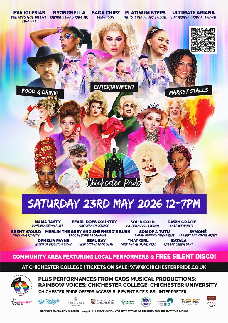 This years the event promises to be the biggest pride event to ever take place in Chichester since the first event back in 2022!  It begins with a huge parade through the streets of Chichester before arriving at the lawns of Chichester College where there are stalls, food and entertainment available for all.